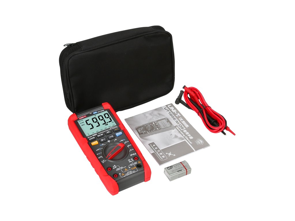 Měřič Uni-T PRO UT195E se vyznačuje pevnou konstrukcí a je napájen 9V baterií (6F22/6LR61). Velikost displeje je 66 x 51 mm, což zajišťuje čitelnost výsledků. Zařízení měří 206,5 x 95,5 x 61 mm a váží 450 g, což činí měřič pohodlným pro použití a přenášení. Jeho stupeň ochrany zajišťuje odolnost a spolehlivost v různých podmínkách práce. Sada obsahuje baterii, měřicí vodiče a pouzdro, což umožňuje okamžité zahájení práce.