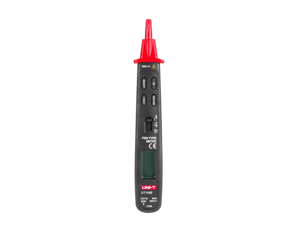 UT118B se vyznačuje mimořádně kompaktní konstrukcí a nízkou hmotností, což z něj činí snadno přenosný a ideální pro práci v místech s omezeným prostorem. Zařízení má rozměry 20 x 27 x 182 mm a váží pouhých 90 g, což zajišťuje pohodlí použití. Podsvícený LCD displej o rozměru 28 x 14 mm zaručuje čitelnost údajů i za špatných světelných podmínek.
