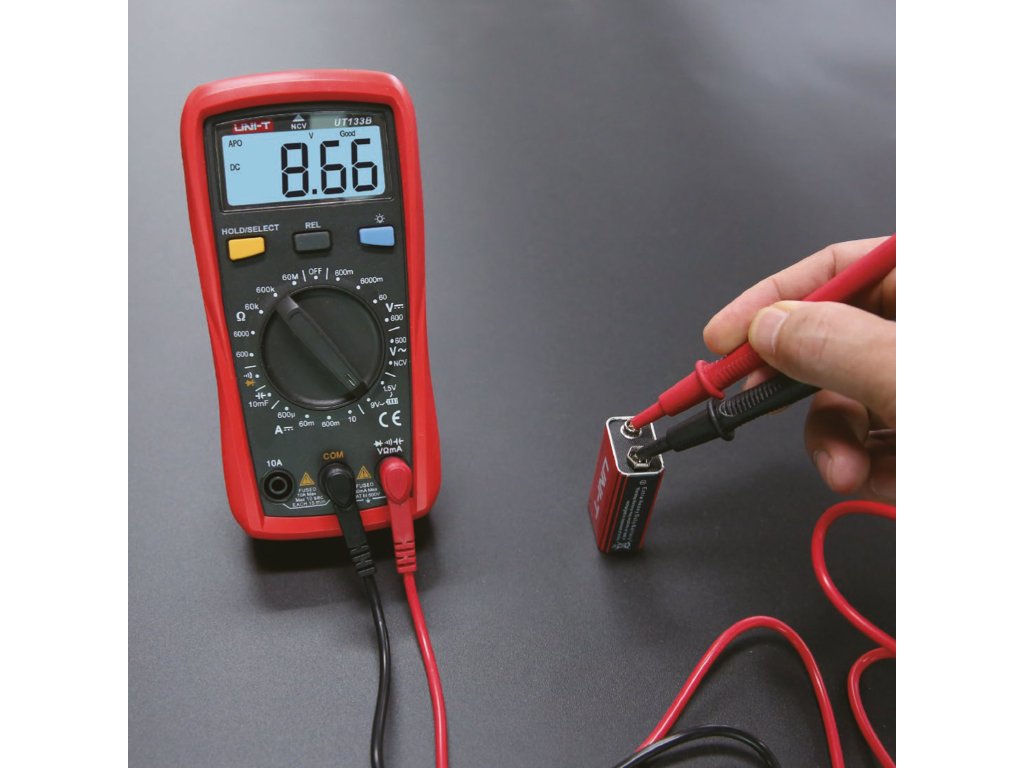 UT133B se vyznačuje ergonomickou konstrukcí s rozměry 155 x 76,5 x 49 mm a hmotností 255 g, což zajišťuje pohodlí při používání a snadný přenos. Měřič má displej o velikosti 56,8 x 36,1 mm, který zajišťuje čitelné záznamy i při slabém osvětlení. Zařízení je napájeno dvěma bateriemi 1,5 V (R03), které jsou součástí balení, takže měřič je připraven k použití ihned po zakoupení. V sadě s měřičem se nachází také měřicí vodiče a pouzdro, které umožňuje bezpečné skladování a pohodlný přenos zařízení.