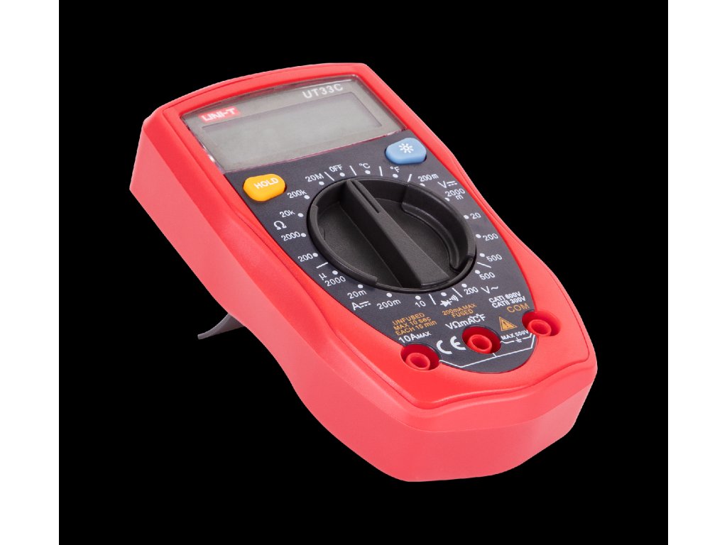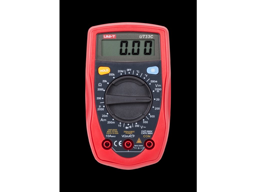 ROZSAHY MĚŘENÍ Stejnosměrné napětí DC: 200 mV/2000 mV/20 V/200 V/500 V ±(0,5%+2) Střídavé napětí AC: 200 V/500 V ±(1,2%+10) Stejnosměrný proud DC: 2000 µA/20 mA/200 mA/10 A ±(1%+2) Odpor: 200 Ohm/2000 Ohm/20 kOhm/200 kOhm/20 MOhm ±(0,8%+2) Teplota: -40°C~1000°C ±(1%+3); -40°F~1832°F ±(1%+4) Kontrola kontinuity obvodu Test diod DODATEČNÉ FUNKCE Ruční změna rozsahů měření Zamražení posledního zobrazení Indikátor nízké úrovně baterie Maximální odečet: 2000 Podsvícený LCD displej OBECNÉ VLASTNOSTI Vstupní impedance stejnosměrného napětí: přibližně 10 MOhm Napájení: baterie 9 V (6F22) Velikost displeje: 48 x 16 mm Rozměry produktu: 130 x 73,5 x 35 mm Hmotnost produktu: 179 g Příslušenství: Baterie, měřící kabely, pouzdro, sonda pro měření teplotyROZSAHY MĚŘENÍ