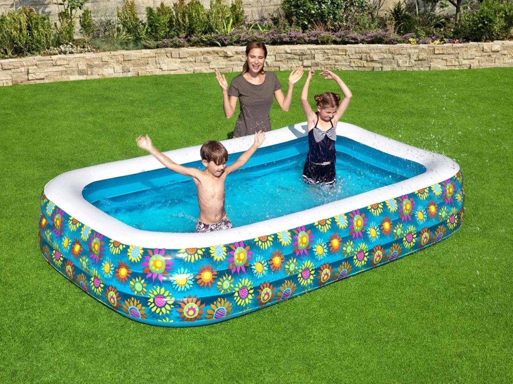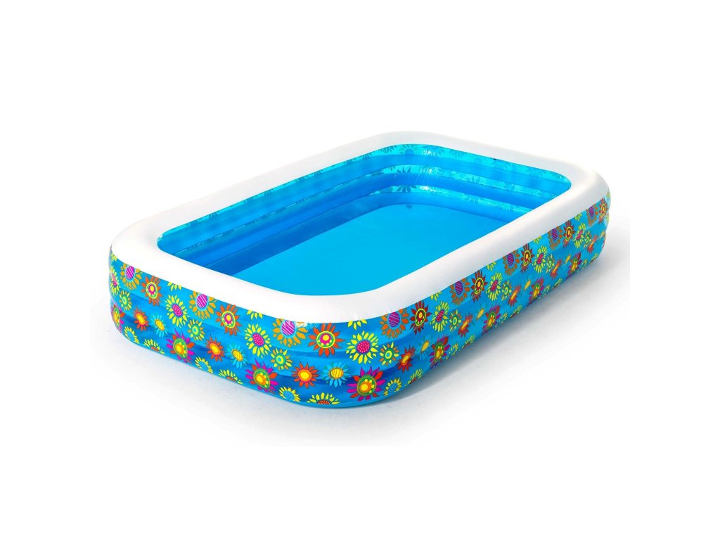 Bazén o rozměrech 305 cm x 183 cm x 56 cm je vyroben z pevného vinylu, který je pokryt grafikou s barevnými slunečnicemi.