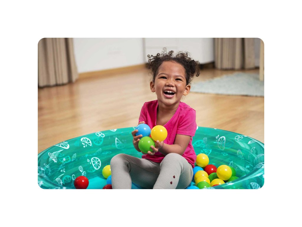 Bazén má měkké nafukovací stěny pro malé děti a nádhernou růžovou barvu.
