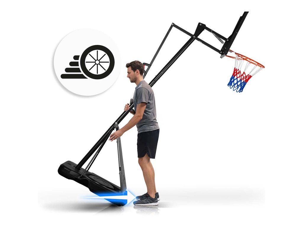 Dvě pevná transportní kolečka v základně umožňují přesunutí koše během několika sekund. Z hřiště na příjezdovou cestu, z garáže na sídlištní hřiště – bez zvedání, bez komplikací. Prostě přesuň a hraj.