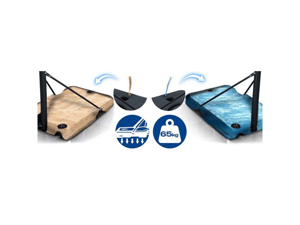 Základna 65 l se dvěma kolečky — naplň vodou nebo pískem, hraj, kde chceš. Přesuň a zahraj si – bez námahy.