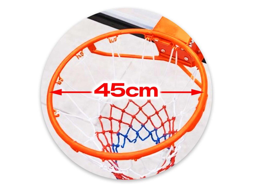 Obruč v zápasovém standardu 45 cm a deska z vyztuženého průhledného PVC — vzhled, odraz i odolnost jako v hale.