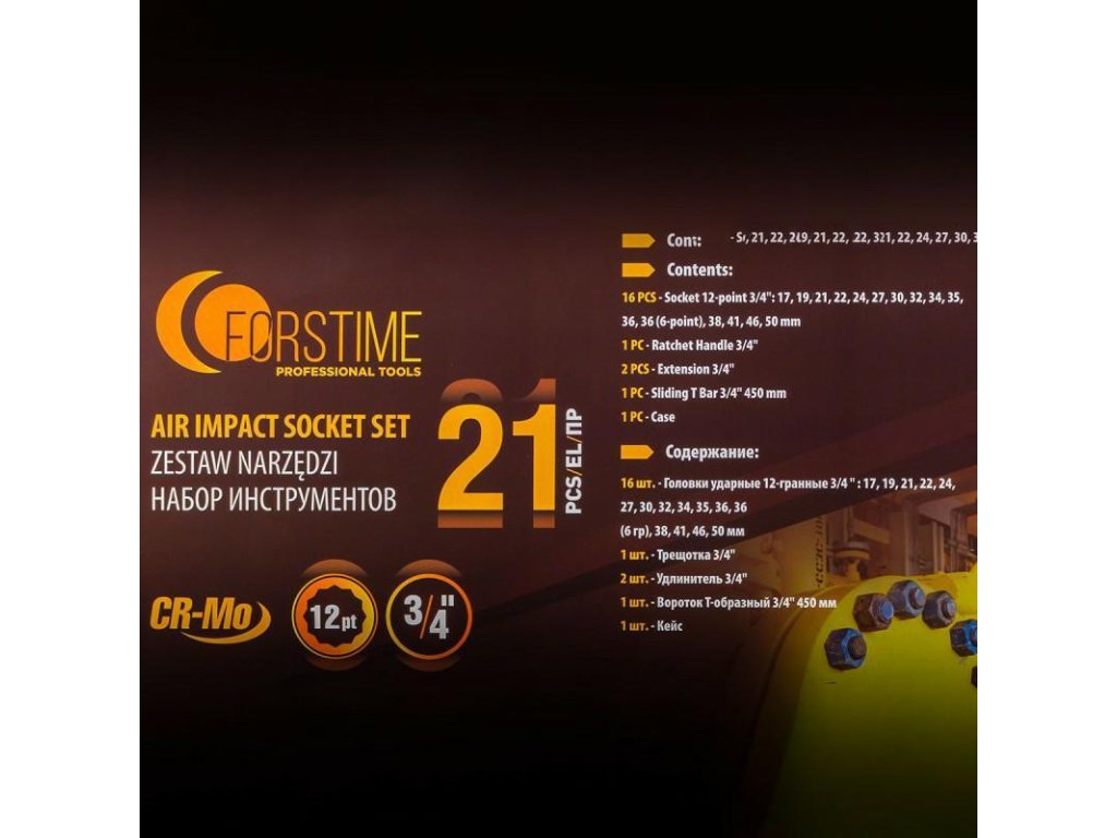 NÁŘADÍ nárazové hlavy 3/4" 21dílná sada nástrojů 17-50mm 12-hranné