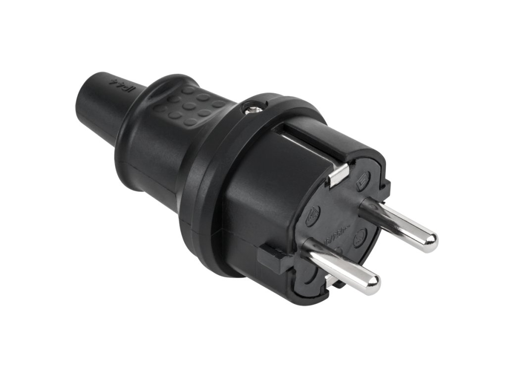 Zástrčka německého typu 16A/250V Materiál: guma IP44 Barva: černá Prodáváno v kartonech Kartón: 25ksZástrčka německého typu 16A/250V