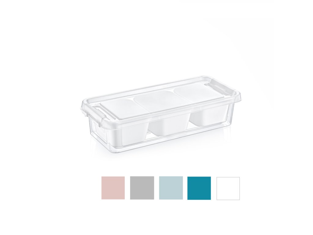 Plastový, obdélníkový kontejner rozdělený na 3 části je vynikající řešení pro každou kuchyni.Díky třem přihrádkám ušetříme mnoho místa v chladničce. Můžeme skladovat 3 různé věci v jednom obalu bez obavy, že se vůně z těchto produktů smíchají.