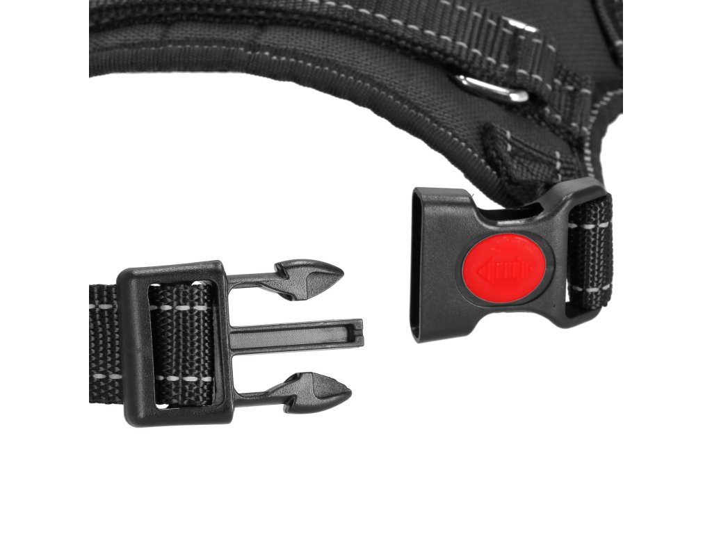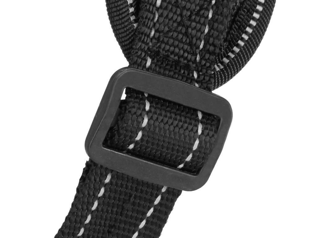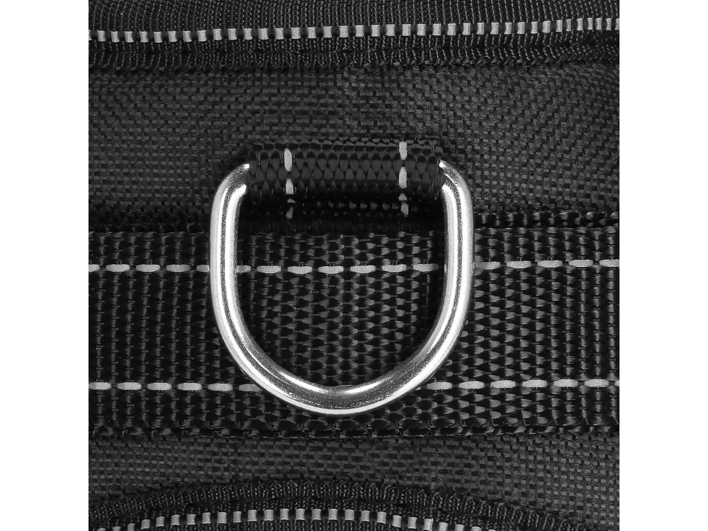 - Kovové prvky pro upevnění rukojeti, kovový D-kroužek pro připojení vodítka.