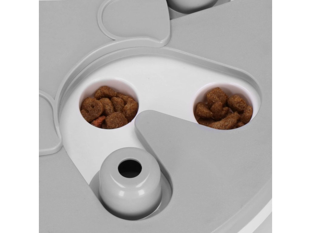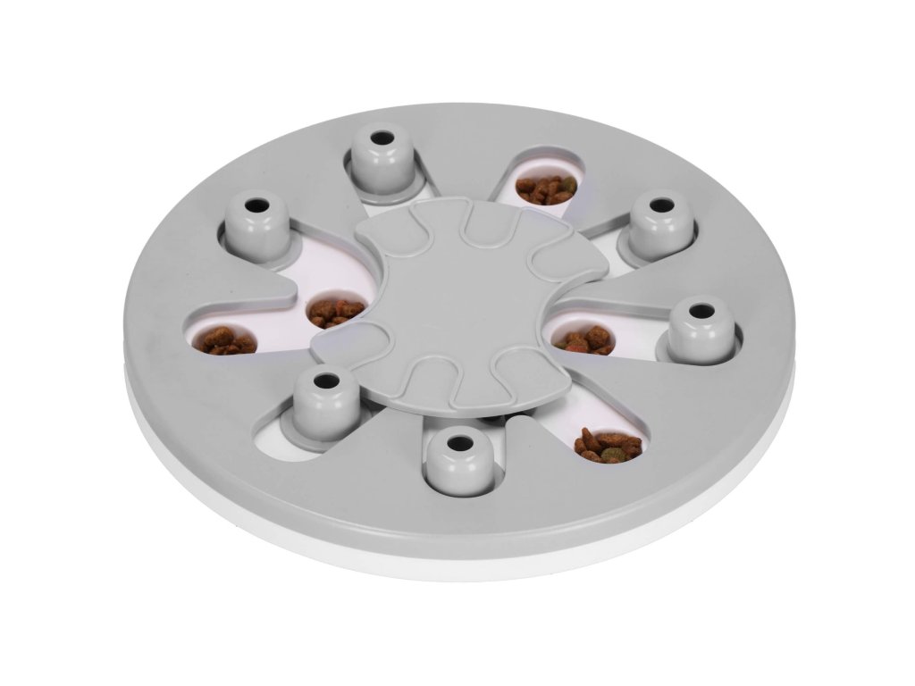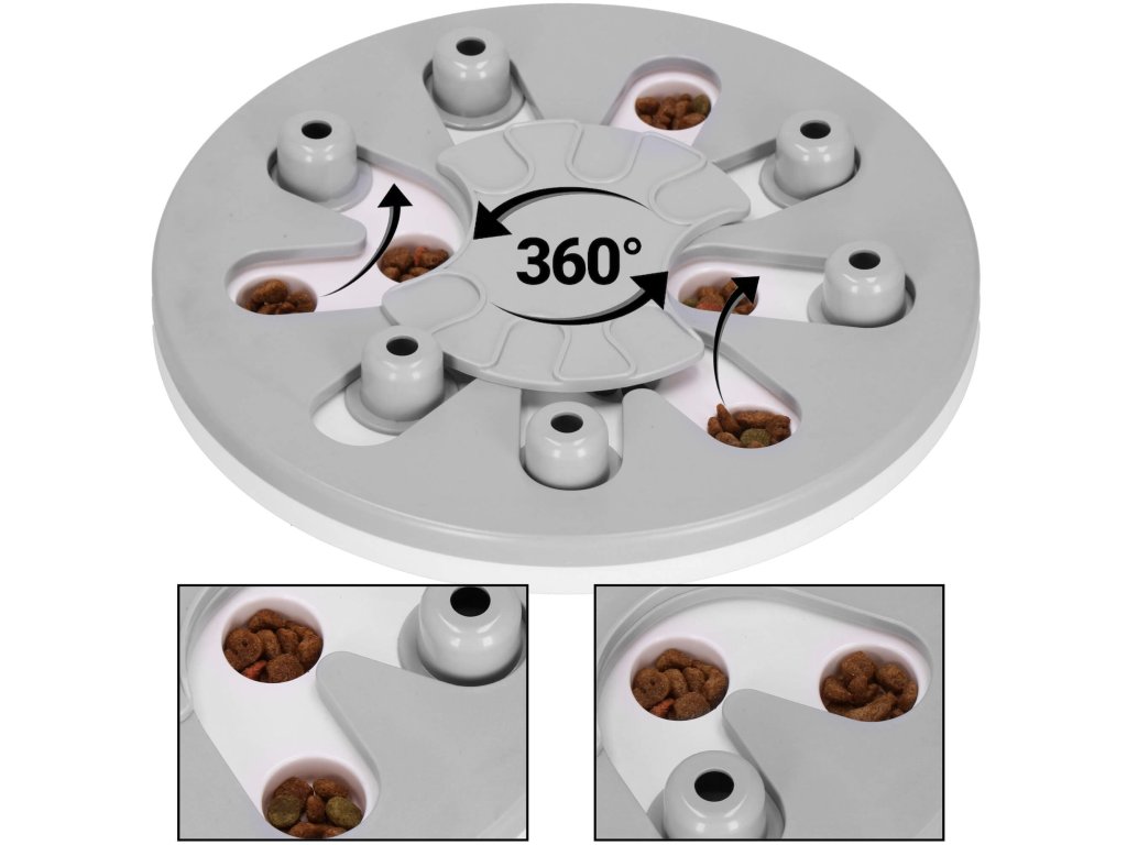 - Hračka má pohyblivé prvky, které může pes posouvat - střední prvek se otáčí a vyčnívající prvky se posouvají podél speciálních drah. V nich se nacházejí prohloubení, do kterých můžete umístit například pochoutky, které je možné zakrýt pohyblivými prvky, a úkolem psa/kočky je je najít.