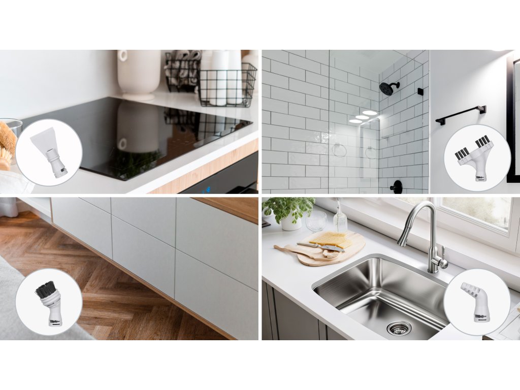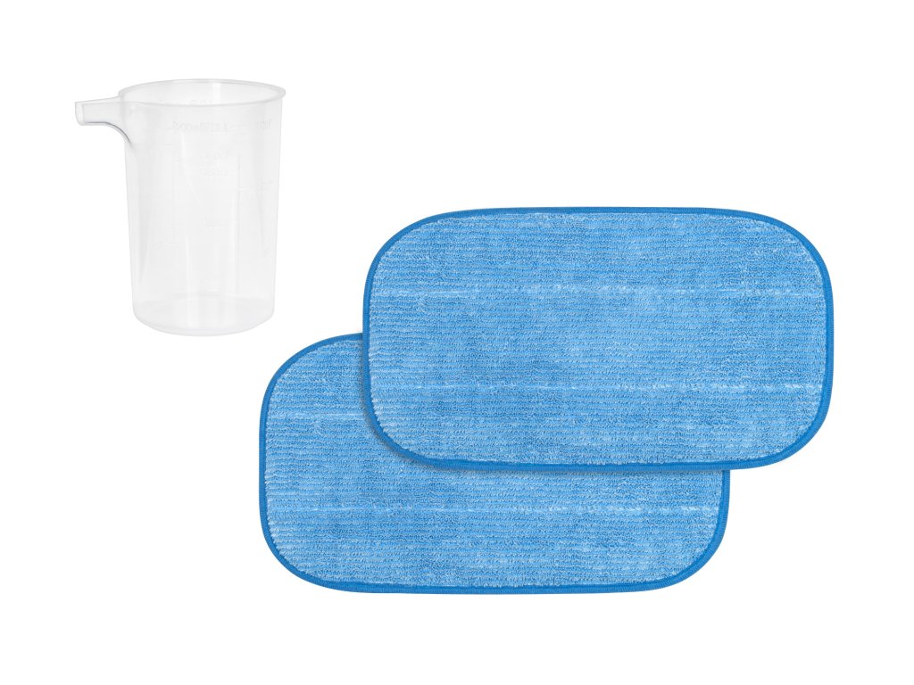 V sadě: 2x hadřík na mopování, nástavec na koberce, odměrka, adaptér, kulatý kartáč, nástavec na spáry, štěrbinový nástavec, škrabka