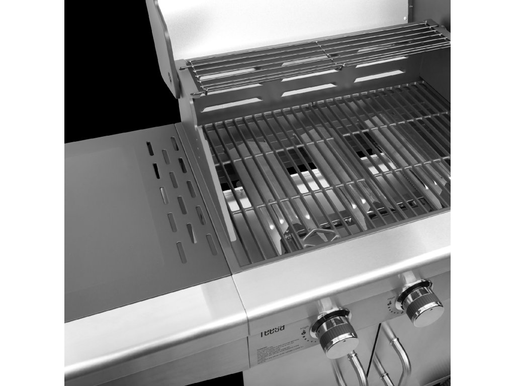Základem plynového grilu Teesa je masivní litinový rošt s velkou kapacitou. Navíc zařízení obsahuje rošt na ohřívání, vyrobený z železa smaltovaného porcelánem, který umožňuje udržet teplotu připraveného jídla.