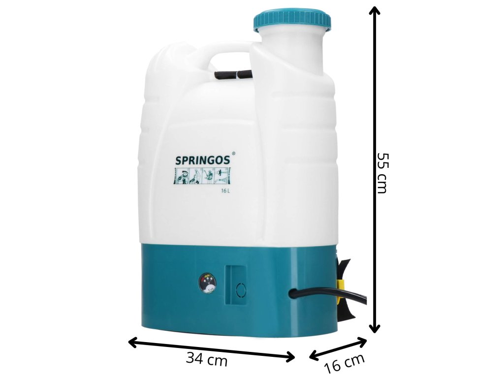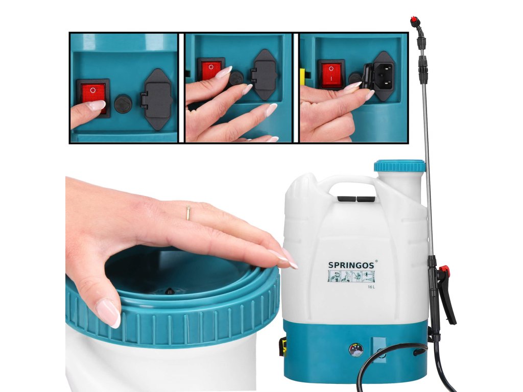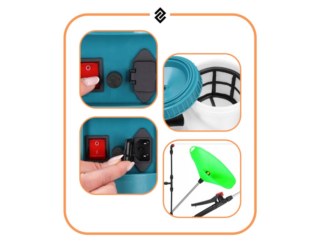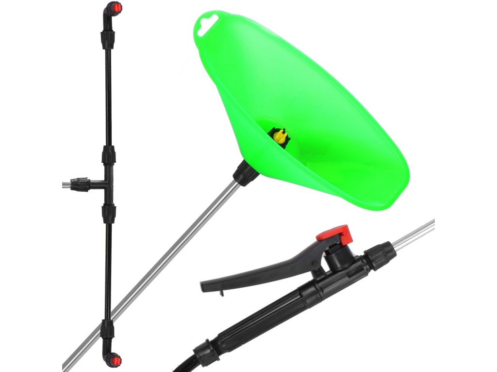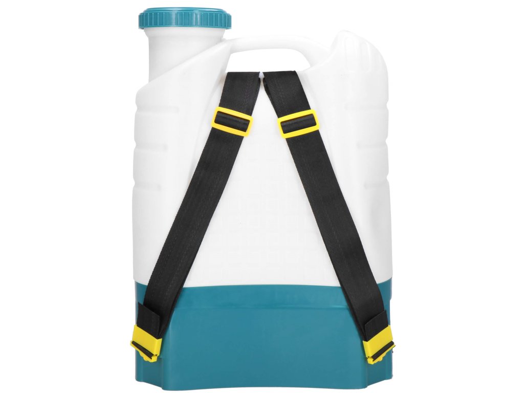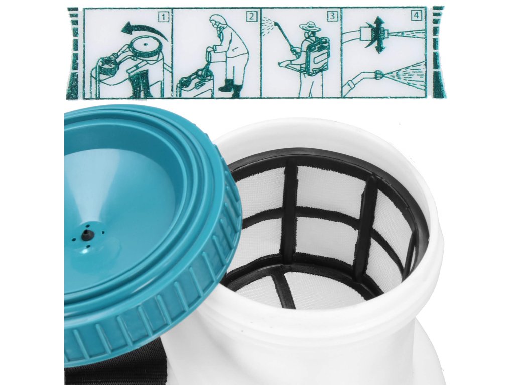 - Na přední straně postřikovače je stupnice od 4 l do 18 l a návod k obsluze ve 4 krocích
