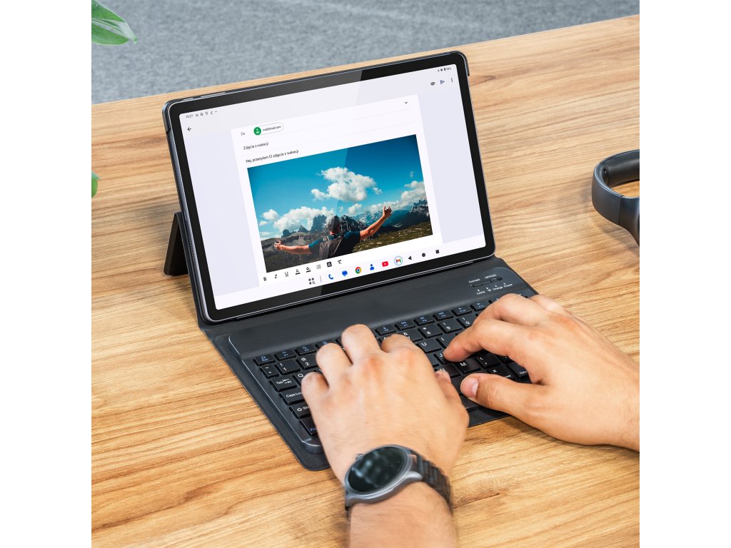 Integrovaná klávesnice se připojuje k tabletu pomocí technologie Bluetooth 5.0 a nabízí stabilní připojení až na 10 metrů. Magnetické uchycení umožňuje snadné odpojení klávesnice v případě potřeby, což zajišťuje flexibilitu při používání. Je to ideální nástroj pro psaní e-mailů, poznámek nebo dokumentů.