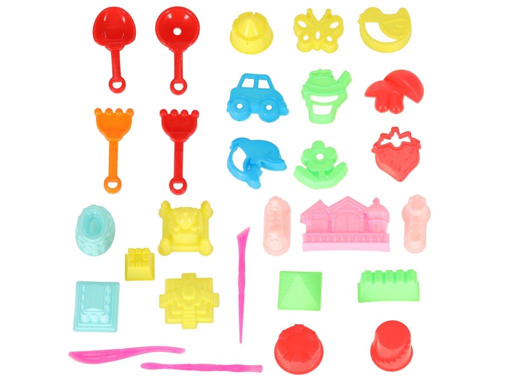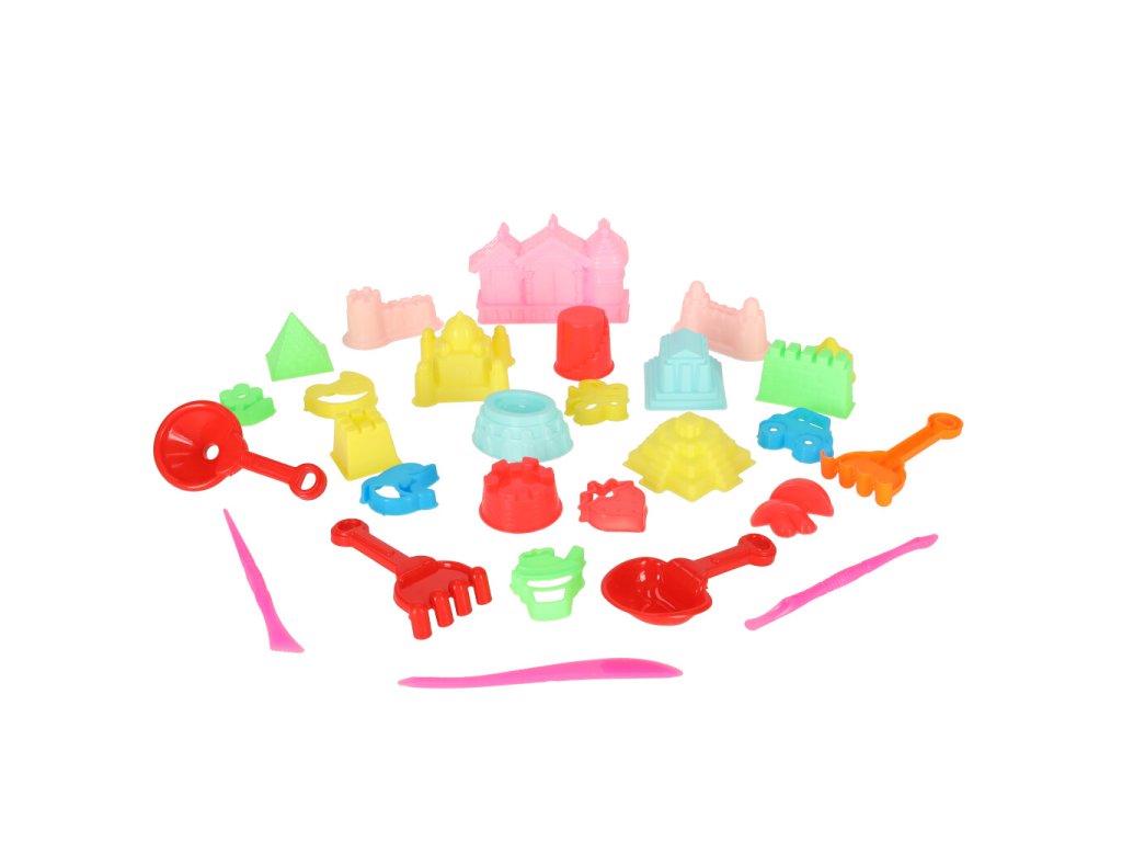 Příslušenství na písek, formičky na hračky a lopatky 28 ks.