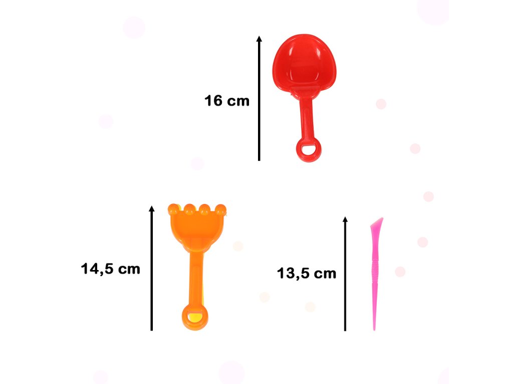 Součástí sady je i lopatka, která usnadní hrabání v písku a jeho nabírání. A zelené hrabličky a tři paličky s různými hroty usnadní vytváření nápaditých vzorů v písku a případný hrad z písku bude opravdu výjimečný.