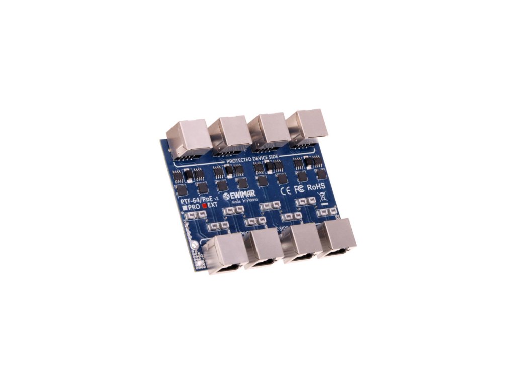PTF-64-ECO/PoE je čtyřkanálový modul odpovědný za přepěťovou ochranu např. IP kamer, LAN přepínačů, routerů, WiFi přístupových bodů a dalších zařízení pracujících v gigabitových sítích. Zařízení je kompatibilní s kabeláží UTP a FTP kategorie 5 a 6. Modul je určen pro sítě 100Base-Tx, 1000Base-T/Tx. Vynikající parametry přenosu dat a vysoká odolnost proti nárazům jsou dosaženy díky inovativním komponentům vícevrstvých plošných spojů. Napájecí zdroje LAN zařízení jsou chráněny před poškozením prostřednictvím nezávislých ochranných obvodů PoE, které eliminují zvýšení napětí mezi páry 1,2 - 3,6 a 4,5 - 7,8 v důsledku přepětí způsobených blesky nebo nekontrolovaným zvýšením napětí. Na chráněné straně (DEVICE) byly použity konektory RJ-45, což umožňuje rychlé přepínání kabelů. Nechráněná strana je vybavena také konektorem RJ-45. Takové řešení zrychluje připojení kabelů, servis složitých ochranných panelů v Rack skříni a usnadňuje jejich připojení k již existujícím instalacím. Pro montáž modulu je třeba použít základnu PTU/PTF-6-RACK, která pojme maximálně 4 moduly různých typů nebo modul může být umístěn v malých instalacích a připevněn ke zdi po instalaci do plastové skříně PTF-6-Box.