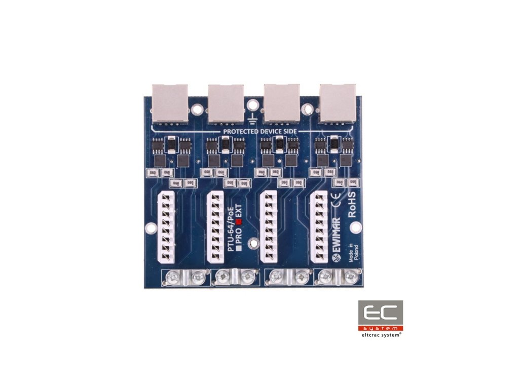 PTU-64-EXT/PoE je čtyřkanálový modul odpovědný za ochranu proti přepětí např. IP kamer, LAN switchů, routerů, WiFi přístupových bodů a dalších zařízení pracujících v sítích 1 Gbit. Zařízení je kompatibilní s kabelovými systémy UTP a FTP kategorie 5, 5e a 6. Modul je určen pro sítě 100Base-Tx, 1000Base-T/Tx. Skvělé parametry přenosu dat a vysoká odolnost proti nárazům jsou dosaženy díky použití inovativních vícevrstvých komponentních plošných spojů. PTU-64-EXT/PoE využívá technologii MOSFET, díky které je možné dosáhnout velmi vysoké úrovně ochrany před přepětím i náhlými změnami potenciálů. Napájení zařízení LAN je chráněno před poškozením prostřednictvím nezávislých ochranných obvodů PoE napájení, které eliminují nárůst napětí mezi páry 1,2 - 3,6 a 4,5 - 7,8 v důsledku přepětí způsobeného bouřkovými výboji nebo nekontrolovaných nárůstů napětí. Na chráněné straně (DEVICE) jsou použity zásuvky RJ-45, díky čemuž je možné rychlé přepojení kabelů. Nechráněná strana je vybavena konektory typu LSA, které umožňují přímé připojení kabelů bez použití RJ-45 konektorů. Takové řešení zaručuje účinnou ochranu proti přepětí a vytváří spojovací systém Patch Panel pro přímé upevnění LAN kabelů. Pro montáž modulu je třeba využít dedikovanou základnu PTU/PTF-6-RACK, která pojme maximálně 4 moduly různých typů.