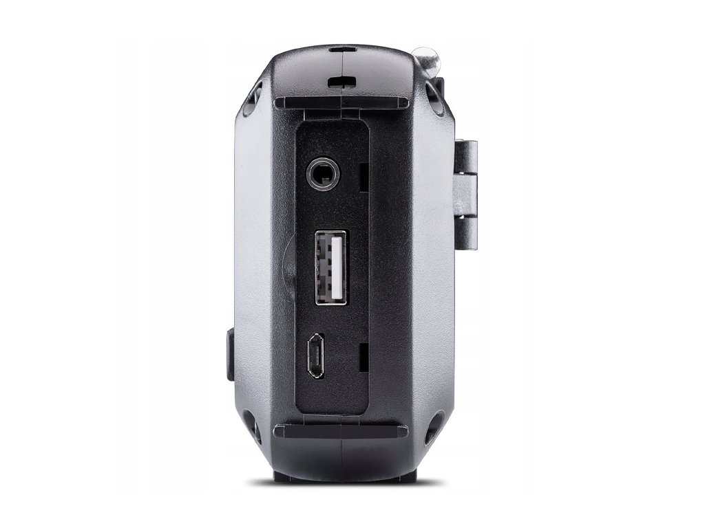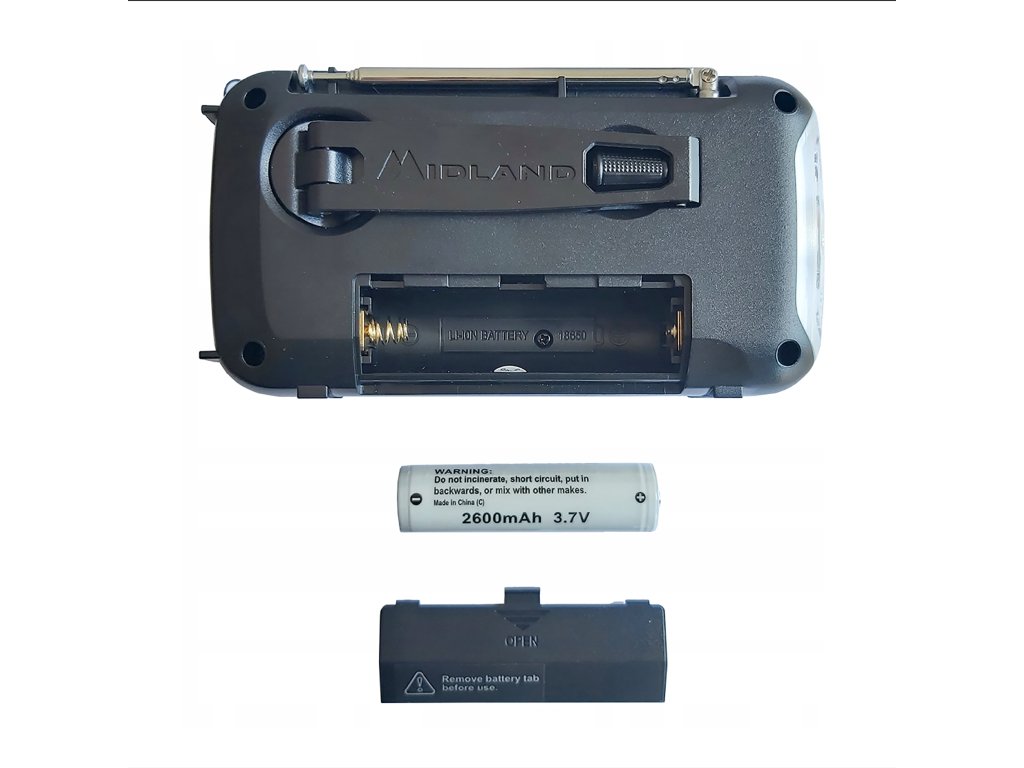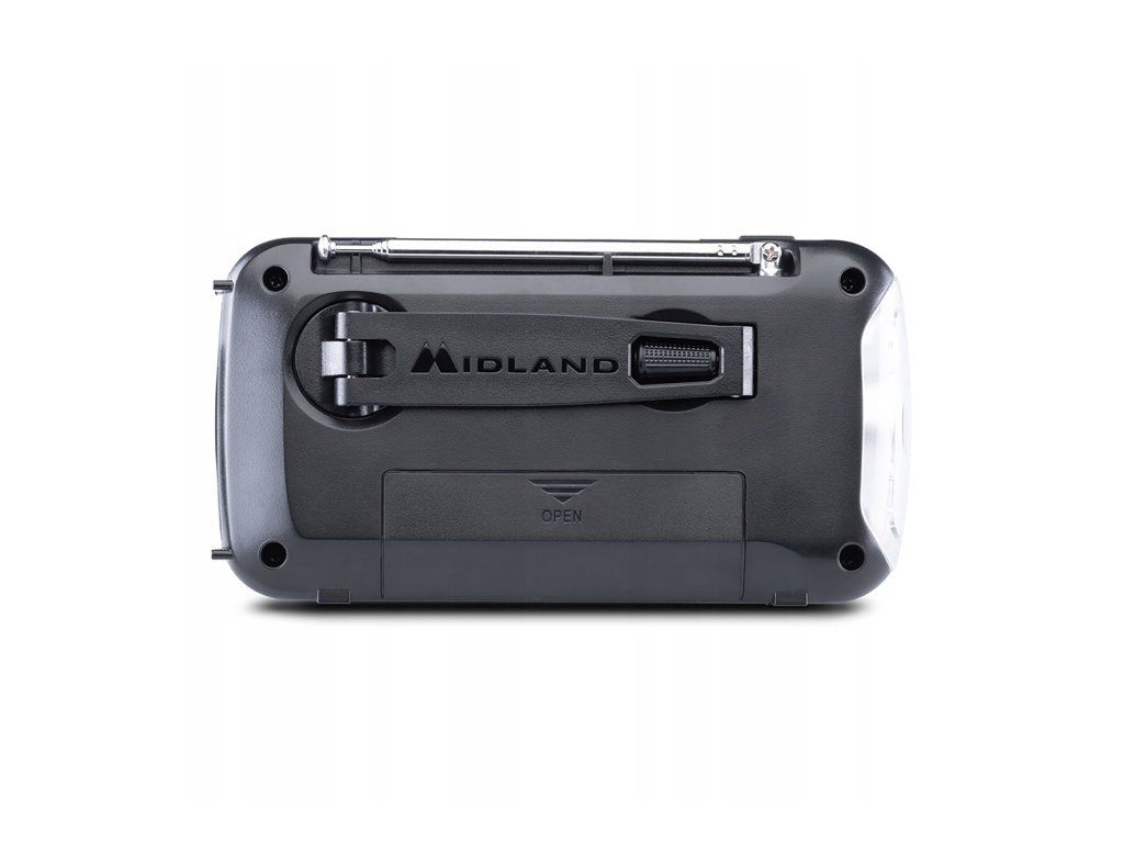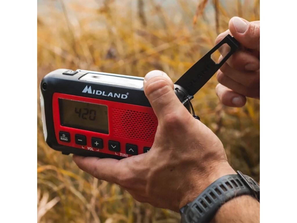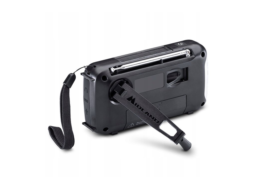 Radio Midland ER100 je výkonný powerbank s možností nabíjení přenosných zařízení, nouzové zařízení vybavené přijímačem AM/FM, určené pro nouzové, katastrofické a bezpečnostní situace, kde je nezbytný stálý kontakt. Radio Midland ER100 je také všestranné řešení pro každodenní použití, během aktivit na čerstvém vzduchu, kempování nebo obecně ve volném čase. Může být nabíjeno pomocí dynama, solárního panelu a USB konektoru. S baterkou a SOS světelnou funkcí.