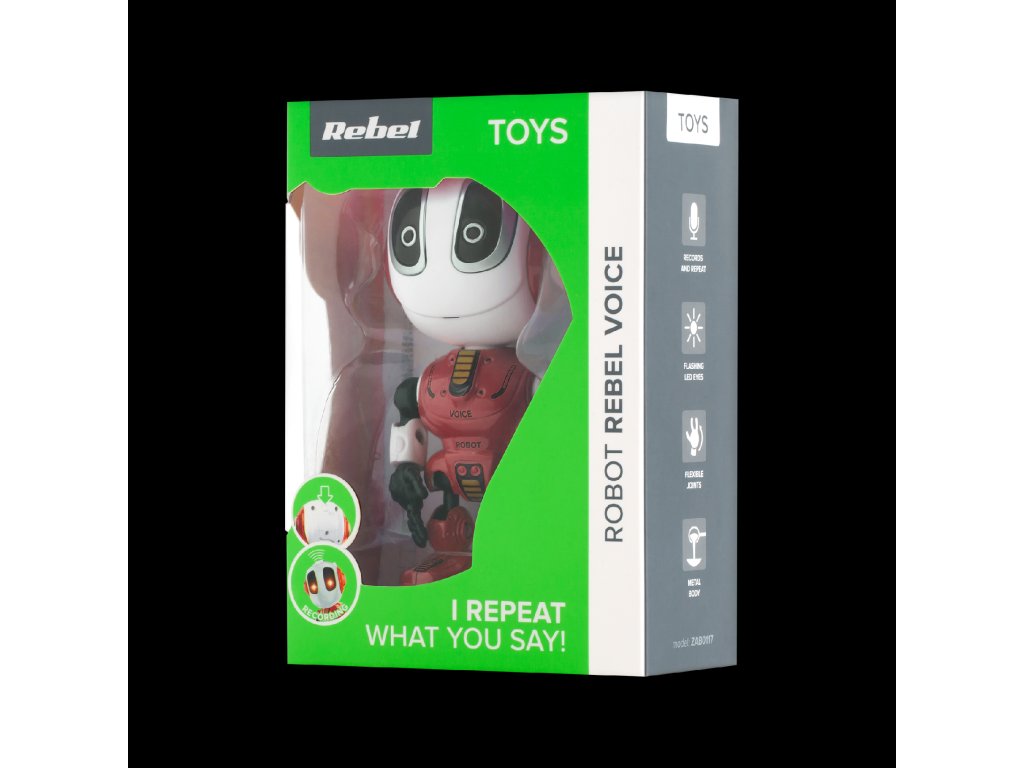 Robot Rebel Voice má pohyblivé ruky a nohy, ako aj svietiace oči. Výrobok sa dodáva v troch farbách: červenej, zelenej a modrej.