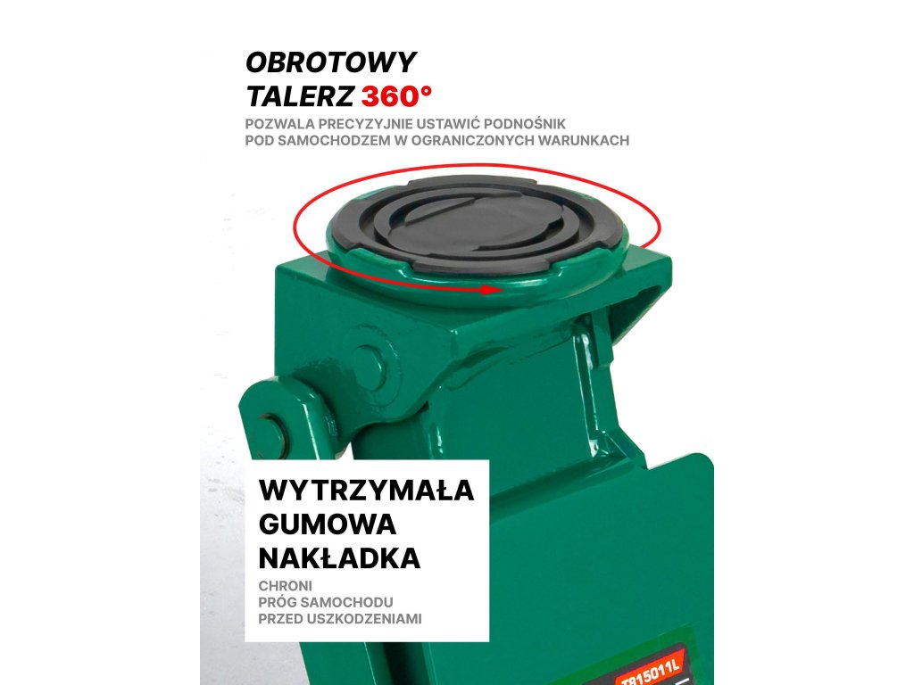 Ergonomická otočná rukojeť umožňuje plynulé a přesné zdvihání a spouštění vozidla. Vzhledem k tomu se vyhnete náhlému padání auta, což je obzvlášť důležité při práci s těžkými vozidly nebo v situacích, kdy se pod autem nachází jemné součásti. Toto řešení dělá obsluhu zvedáku intuitivní a bezpečnou dokonce i pro méně zkušené uživatele.