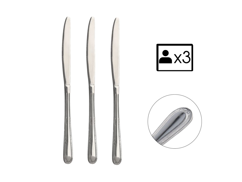 Sada 3 kusů nožů vyrobených z vysoce kvalitní nerezové oceli. Série „Natalia“ má klasický zaoblený tvar s jemným vzorem, který se ideálně hodí na stůl spolu s tradičním stolováním.Doplňkové parametry