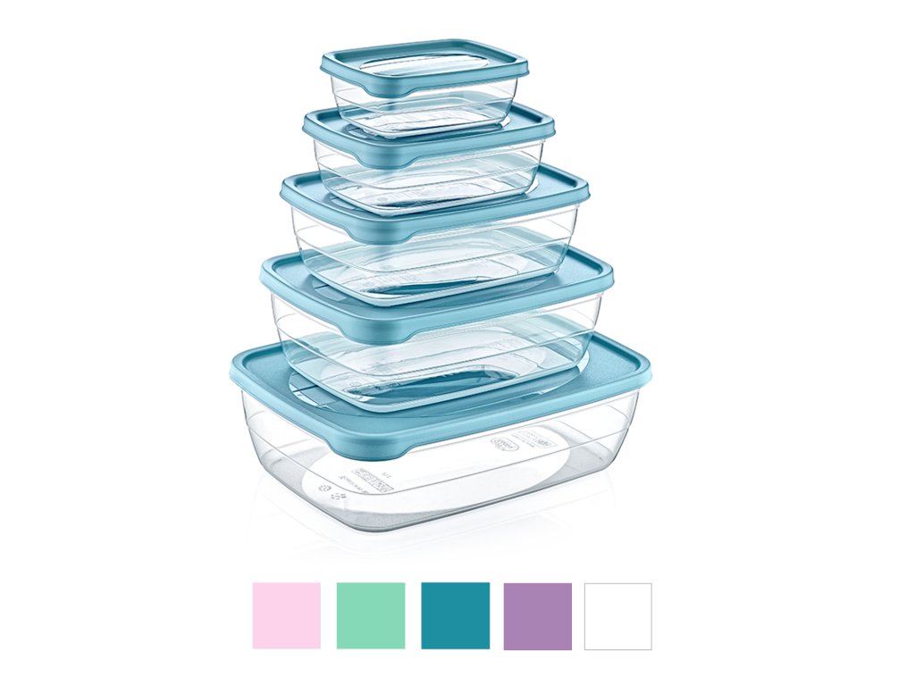 Sada 5 obdélníkových nádob s různými kapacitami.Díky různé kapacitě není nutné dokupovat nádoby samostatně, další výhodou je velká úspora místa v skříni, díky možnosti vložit "jednu nádobu do druhé".