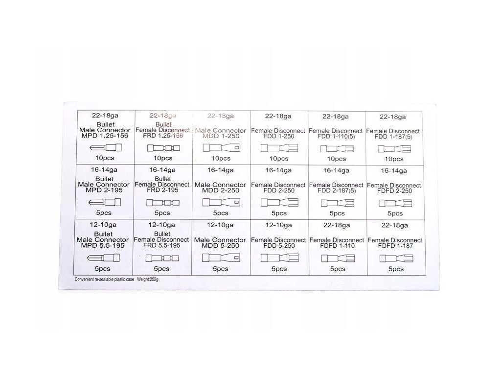 Konektory jsou roztříděny a označeny. Sada obsahuje mnoho rozměrů.