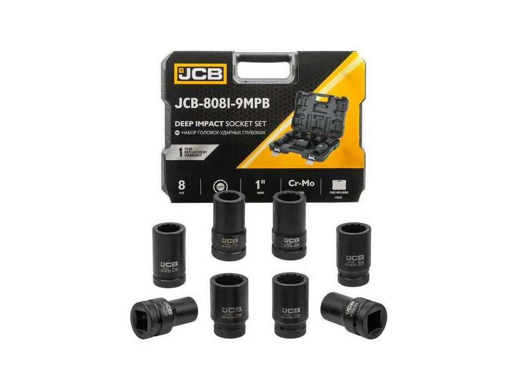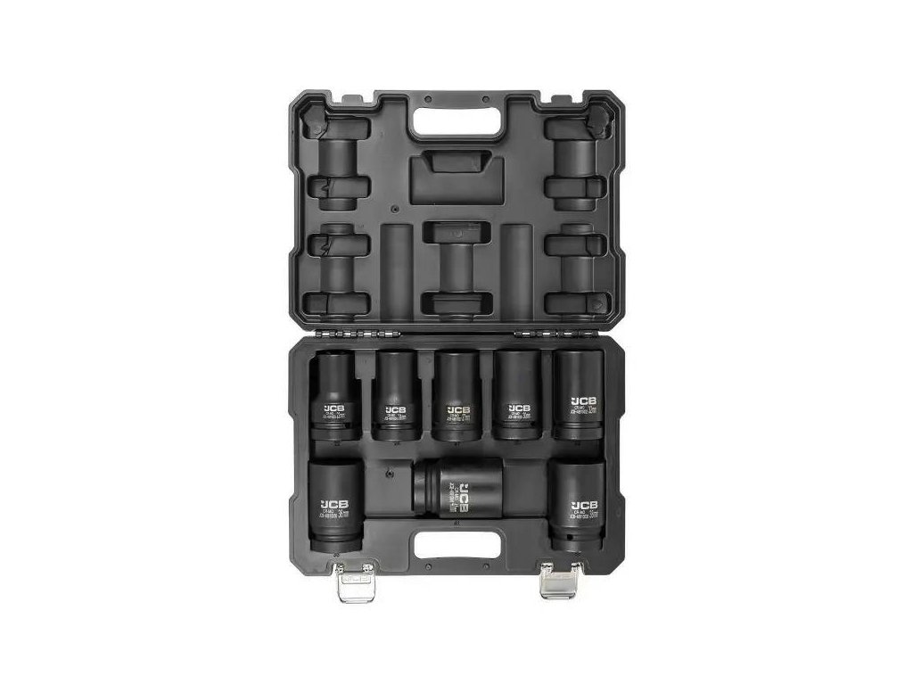 Sada 8 hlubokých nárazových hlavic JCB Tools je profesionální nástroj určený na intenzivní dílenské práce, včetně montáže a demontáže šroubů a matic pomocí nárazových klíčů.