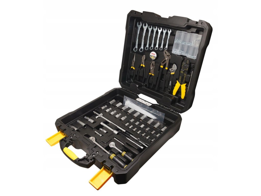 | Sada nástrojů v kufříku (Mobilní kufr 2 v 1). Vybavená kolečka usnadňující přesun kufříku a teleskopická rukojeť. Perfektně vyrobený kufr na nástroje. Celá sada je vyrobena s důrazem na pevnost. Kufr s kolečky a teleskopickou rukojetí na přepravu sady (jako cestovní kufr). |