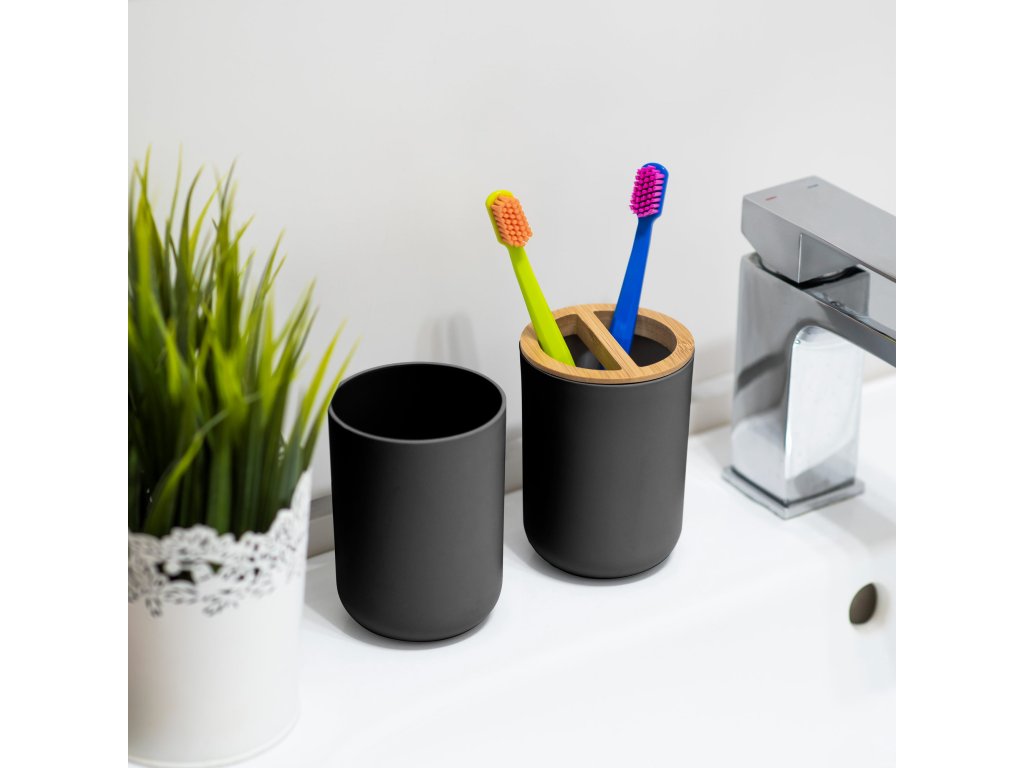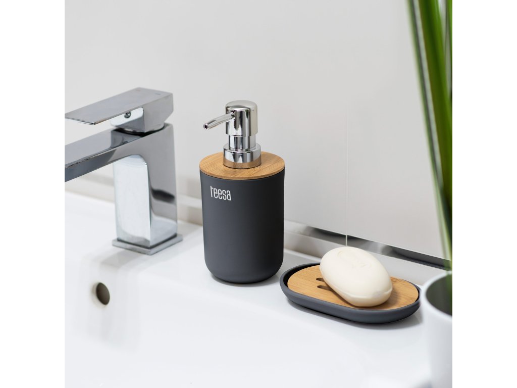 Sada obsahuje takové koupelnové doplňky, jako jsou mýdlenka, dávkovač mýdla, kelímek, kelímek na zubní kartáčky, dále WC kartáč a odpadkový koš. Všechny koupelnové doplňky jsou vyrobeny z vysoce kvalitního plastu s přídavkem bambusu.