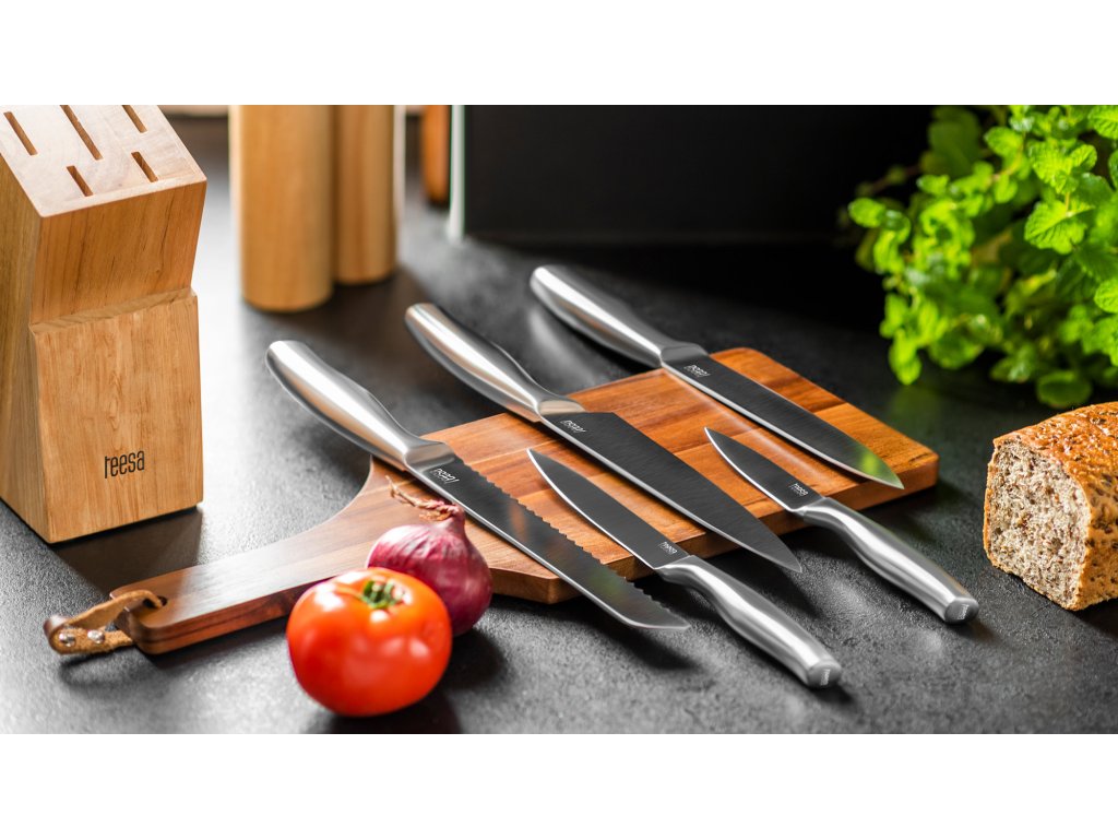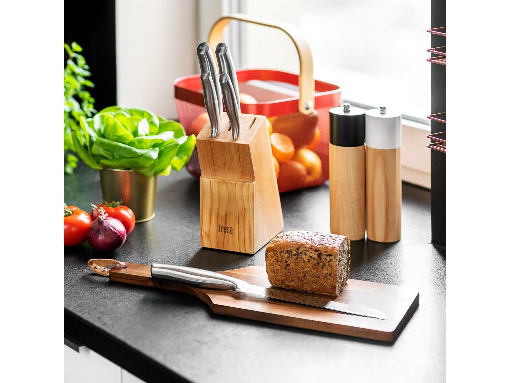 Tato sada kuchyňských nožů v bloku ze dřeva nejen esteticky vypadá, ale také rozhodně usnadňuje udržování pořádku, zabírá málo místa na pracovní desce a díky 5 různým čepelím je univerzální. Nože ze sady Teesa vám pomohou při mnoha každodenních činnostech jako je krájení chleba, masa, filetování ryb, loupání ovoce a zeleniny nebo sekání bylinek.