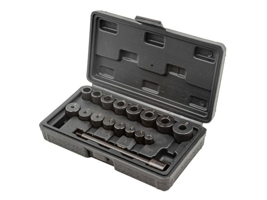 Sada přizpůsobená pro rychlou a přesnou montáž a demontáž osových ložisek, těsnicích kroužků, pouzder např. alternátorů, čepů, ojnic a startérů atd.