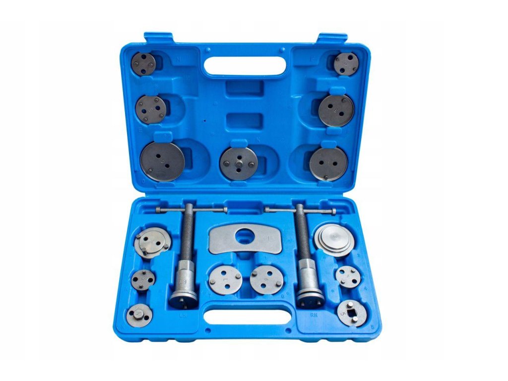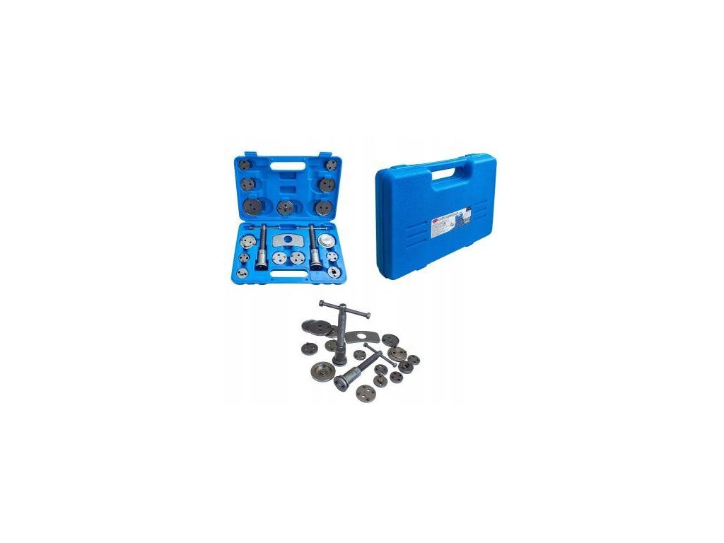 Nezbytná při opravách vozidel vybavených kotoučovými brzdami. Sada slouží k vtlačení (tlačení) pístků v brzdových válcích. Je nezbytná při opravách vozidel vybavených kotoučovými brzdami. Přesné přizpůsobení adaptéru a pístu je zárukou správného zasunutí pístu do válce brzdového třmenu. Nezbytná pro každou autodílnu, kde pomáhá zrychlit servisování brzdových systémů.