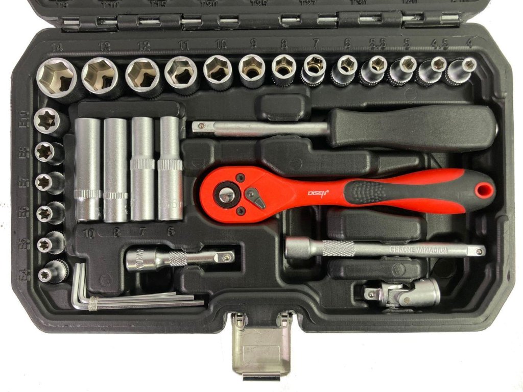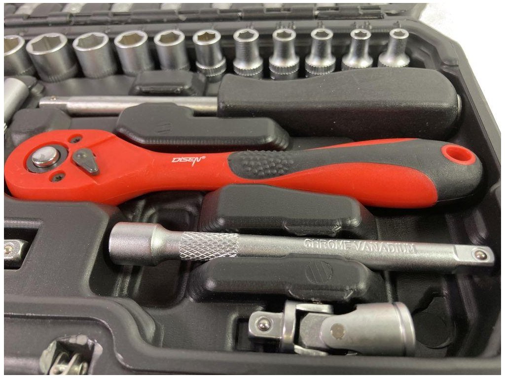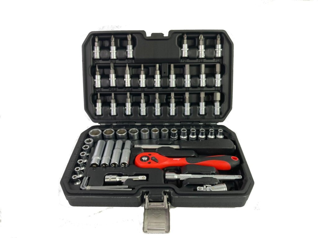 Sada obsahuje ráčnu vybavenou odolným ráčnovým mechanismem. Sada zahrnuje bohatou nabídku nástrčných hlavic (velikosti od 4 do 14 mm) a nástrček pro svíčky, šroubovacích bitů (ploché, křížové, šestihranné, Torx). Doplňkem je prodloužení, univerzální kloub, držák na bity. Prvky jsou umístěny v praktickém kufříku. Sada je ideální pro profesionální i amatérské použití. Profesionální výroba a tvrzená chróm-vanadiová ocel zaručují pevnost a trvanlivost. Všechny rozměry klíčů jsou označeny pro pohodlí uživatele.