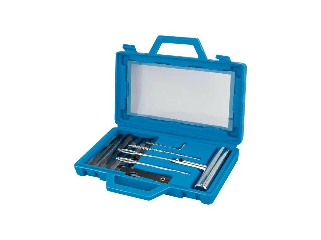 Komplexní sada 12 prvků – obsahuje všechny potřebné doplňky na efektivní a rychlou opravu bezdušových pneumatik.