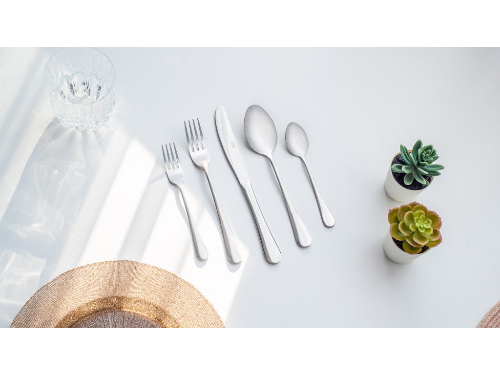 Sada obsahuje polévkové lžíce, vidličky, nože, čajové lžičky a dezertní vidličky. Jemný design s oblejšími hranami zajišťuje, že se příbory budou skvěle hodit ke každému typu stolního nádobí. Vysoký komfort použití zajišťuje nejen dokonalé vyvážení každého prvku, ale také pevné provedení a snadnost čištění.