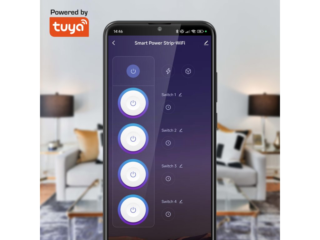 Díky připojení WiFi 2,4 GHz a aplikaci Tuya můžete ovládat zásuvku z libovolného místa – stačí smartphone. Zapínejte a vypínejte jednotlivé zásuvky, monitorujte spotřebu energie a vytvářejte pracovní harmonogramy zařízení. Aplikace je dostupná pro systémy Android a iOS a její intuitivní rozhraní dělá použití smart funkcí rychlým a pohodlným pro každého uživatele.