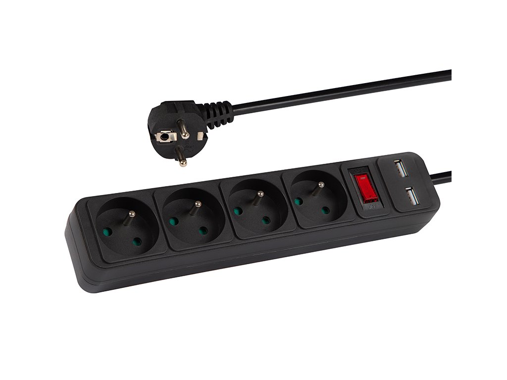 Síťová prodlužovačka PR-470WSP/USB 4-Zásuvky+USB s uzemněním+vypínač 1,5m ČERNÝ 3x1,5mm
