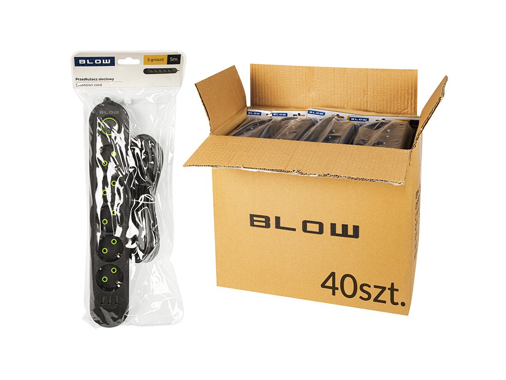 Síťová prodlužovací šňůra BLOW v černé barvě s pěti zásuvkami určená pro domácí použití. Prodlužovací šňůra umožňuje připojit zařízení, která jsou daleko od elektrické zásuvky. Produkt má na jedné straně 5 zásuvek otočených pod úhlem a vypínač, a na druhé straně jediný úhlový síťový zástrčku.