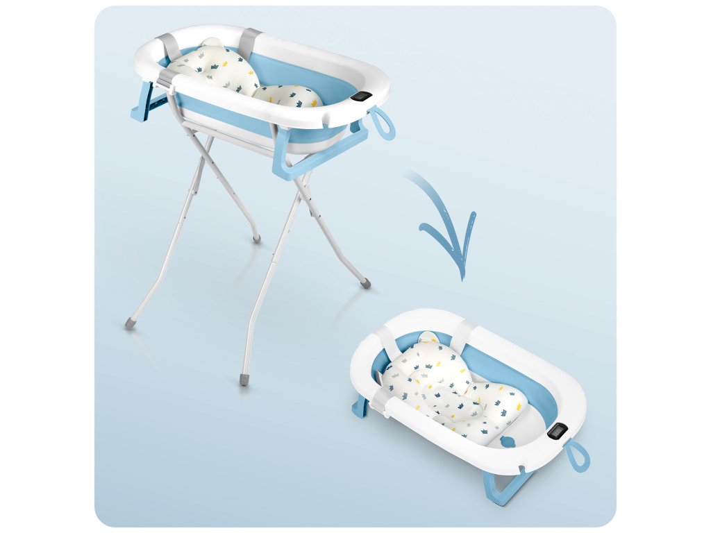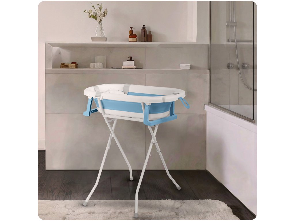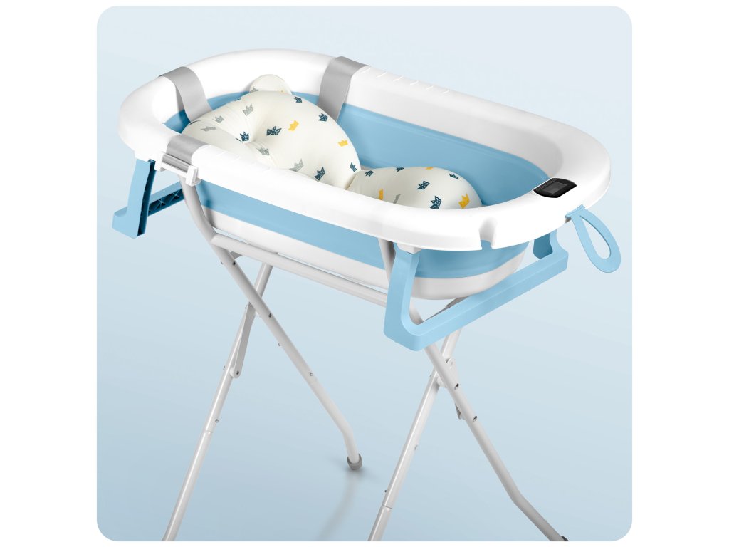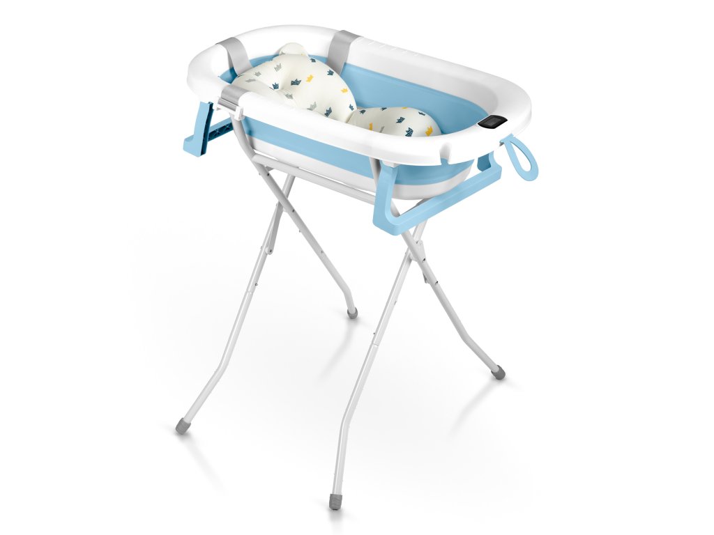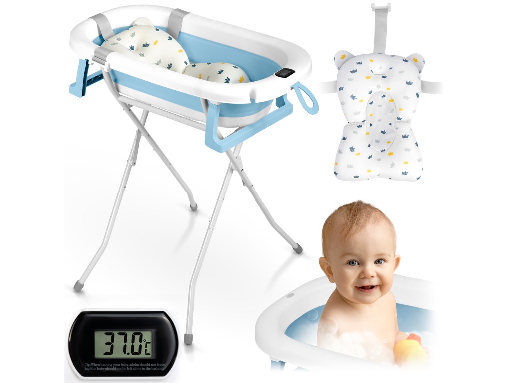 Skládací vanička pro děti a kojence se stojanem, teploměrem a vložkou Ricokids RK-287 bílo-modrá