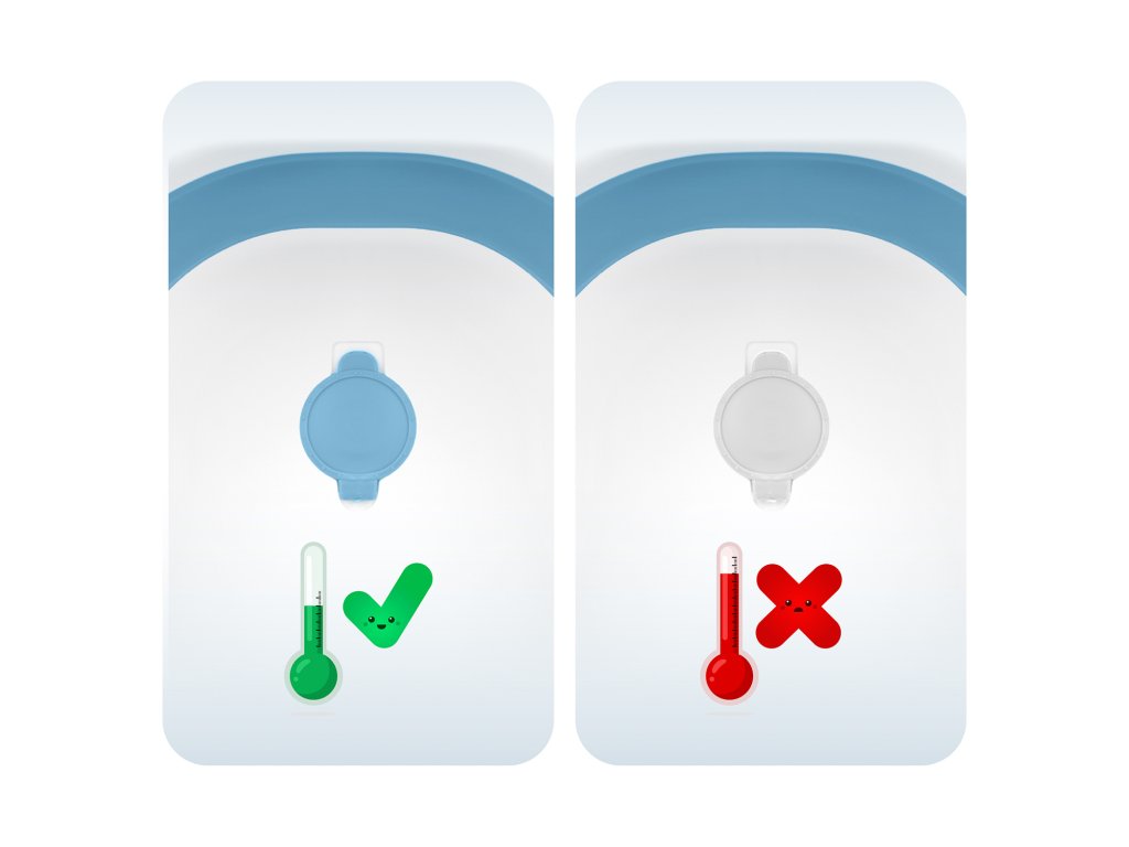 Zátka změní svou barvu z modré na bílou, pokud teplota vody překročí 38°C.