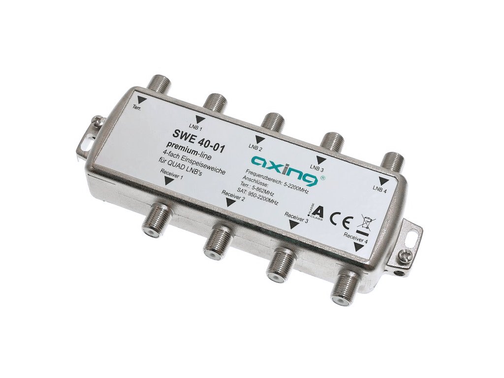 Výhybka SWE 40-01 umožňuje spojení signálů pozemní televize (vstupní frekvence v rozsahu 47-860MHz) se čtyřmi satelitními signály (frekvence v rozsahu 950-2150 MHz ze dvou polarizací) a jejich přenos do 4 nezávislých míst odběru; k rozdělení takto sloučeného signálu na radiový, televizní a satelitní jsou potřebné čtyři zásuvky typu GARSAT); Technické údaje: model: Axing SWE40-01; frekvenční rozsah pro vstup RTV: 47-862 MHz; frekvenční rozsah pro vstup Sat: 950-2250MHz; útlum přechodu RTV 8dB: útlum přechodu Sat 2dB: vstupy/výstupy - zásuvky typu F; pasivní prvek nevyžadující napájení; pro vnitřní použití; rozměry: 138x127x48mm; rozteč montážních otvorů: 120mm (horizontálně) a 110mm (vertikálně);Výhybka SWE 40-01 umožňuje spojení signálů pozemní televize (vstupní frekvence v rozsahu 47-860MHz) se čtyřmi satelitními signály (frekvence v rozsahu 950-2150 MHz ze dvou polarizací) a jejich přenos do 4 nezávislých míst odběru;