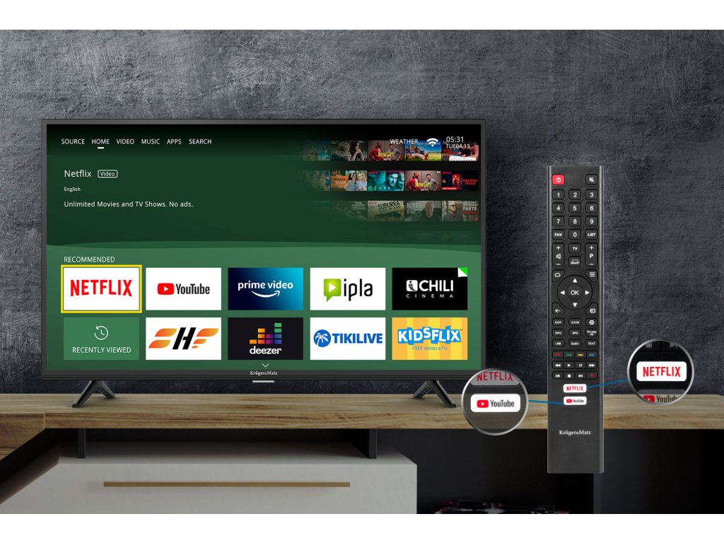 Televizor smart Kruger&Matz je vybaven řadou portů, díky kterým můžete libovolně připojovat další zařízení a proměnit jej v multimediální zábavní platformu. Sledujte filmy, připojte herní konzoli nebo domácí kino a plně využijte potenciál své televize.