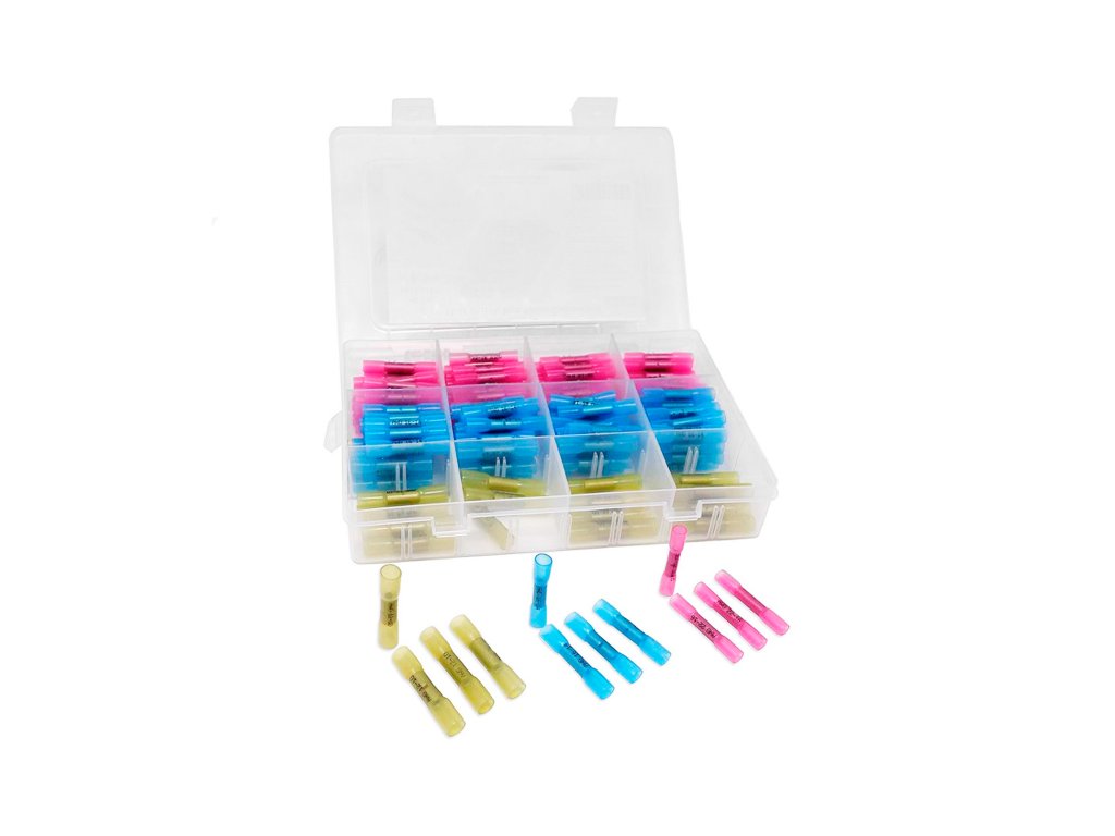 Sada 200 kusů teplem smršťovacích rychlospojek Teplem smršťovací rychlospojka s objímkou je nepostradatelná v případě, že chceme pevně a spolehlivě spojit nebo opravit vodiče. V teplem smršťovací trubičce se nachází spojovací objímka, kterou je třeba stisknout pomocí lisovacích kleští nebo kombinovaných kleští. Po spojení vodičů není vyžadována žádná dodatečná izolace. Sada obsahuje: 90 rychlospojek v rozsahu: 0,5~1mm2 90 rychlospojek v rozsahu: 1,5~2,5mm2 20 rychlospojek v rozsahu: 4~6mm2 Technické údaje: - Pracovní teplota: -55°C ~ 125°C - Teplota smrštění: nad 150°C - Stupeň smrštění: 3:1Sada 200 kusů teplem smršťovacích rychlospojek