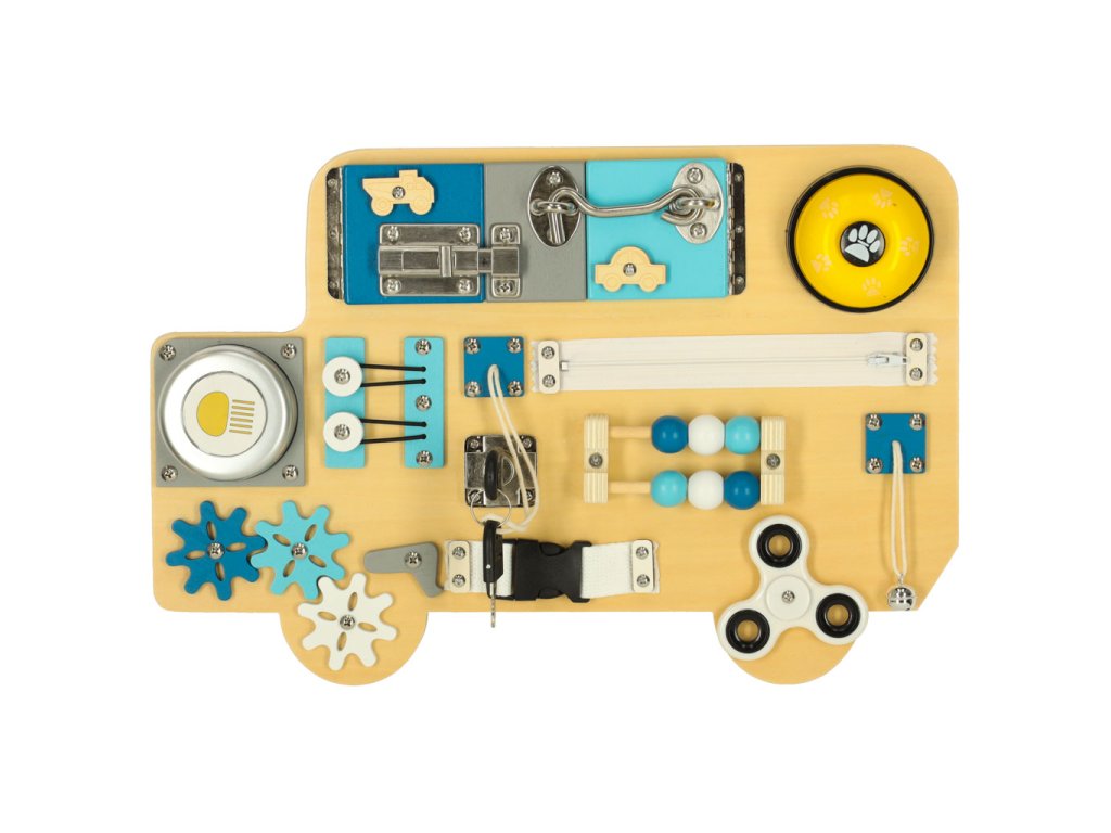 Manipulační deska ve tvaru autobusu. Má mnoho prvků, které může batole otevírat, přesouvat nebo otáčet. Zaručuje rozvoj manuálních a intelektuálních dovedností a také fantastickou zábavu. Materiál: dřevo. Rozměry: 40 x 26,5 cm.Doplňkové parametry