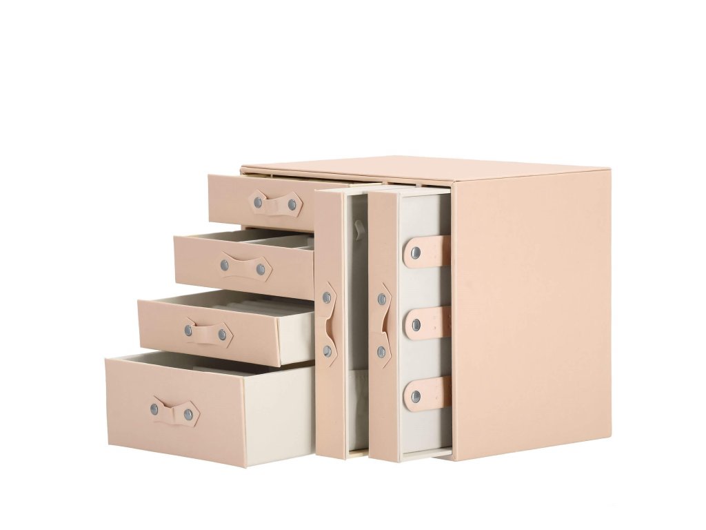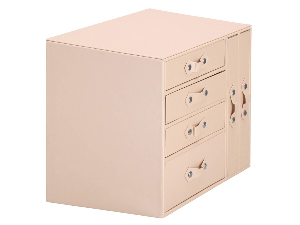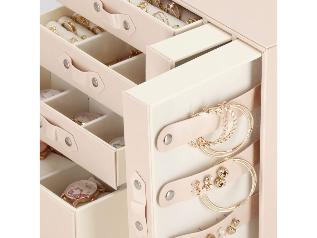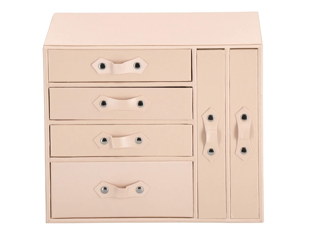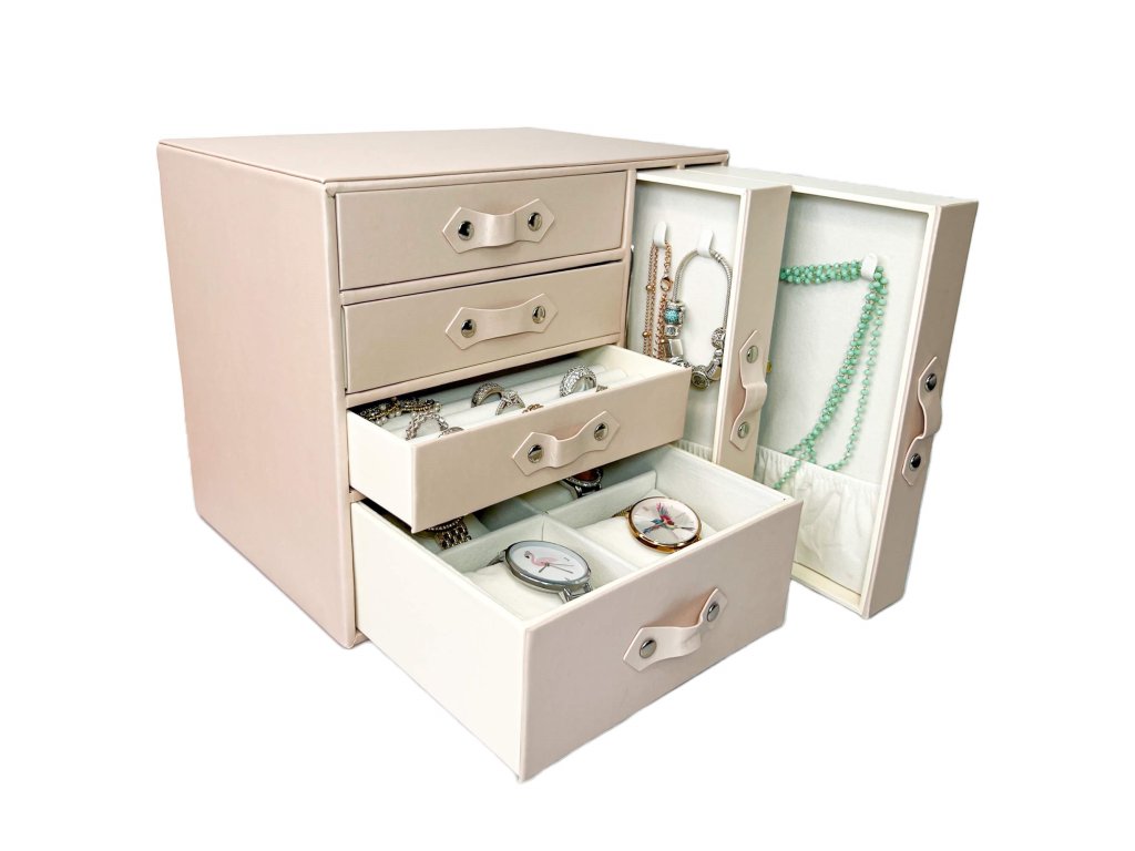 - 1 boční zásuvka: 2 držáky na přívěsky/náhrdelníky + boční síťka/3 odnímatelné náušnicové pásky