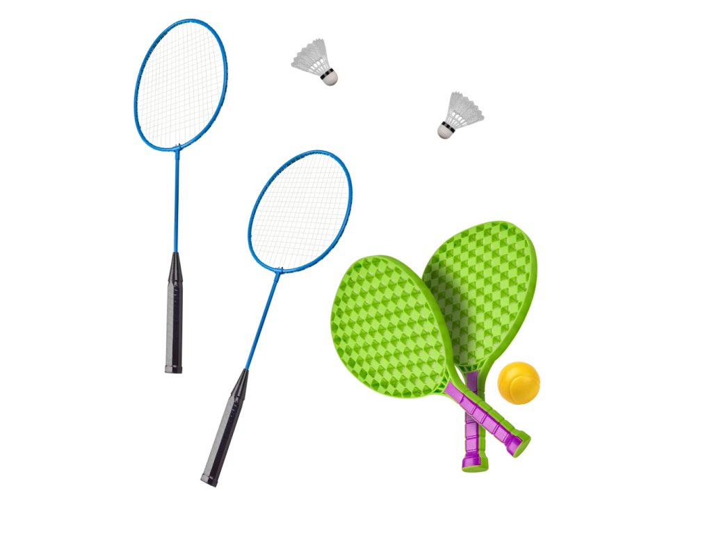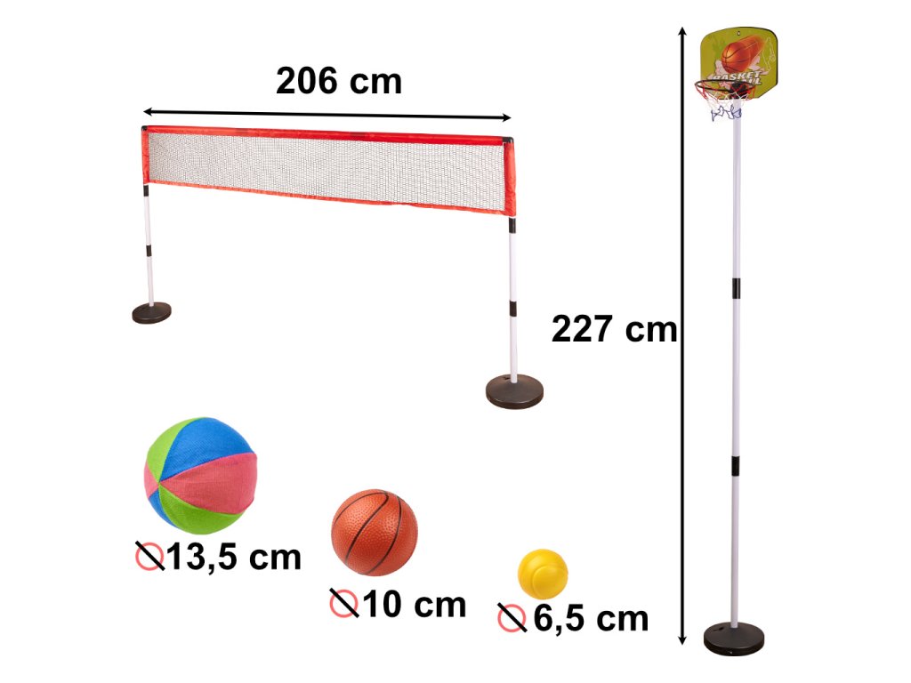 Sada obsahuje příslušenství potřebné na badminton, volejbal, basketbal, tenis a frisbee. Sada je přizpůsobena výšce nejmenších hráčů - volejbalová a badmintonová síť je vysoká 126 cm a basketbalový koš je vysoký 227 cm. To poskytuje dítěti pohodlí a uspokojení z hry bez ohledu na věk nebo schopnosti.