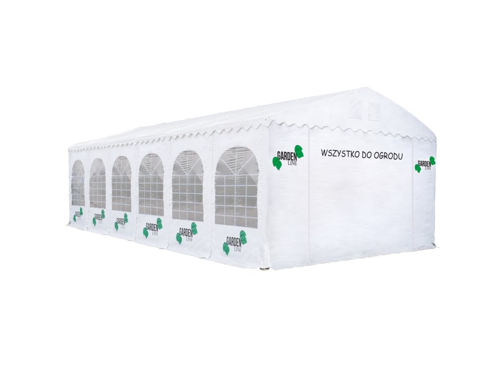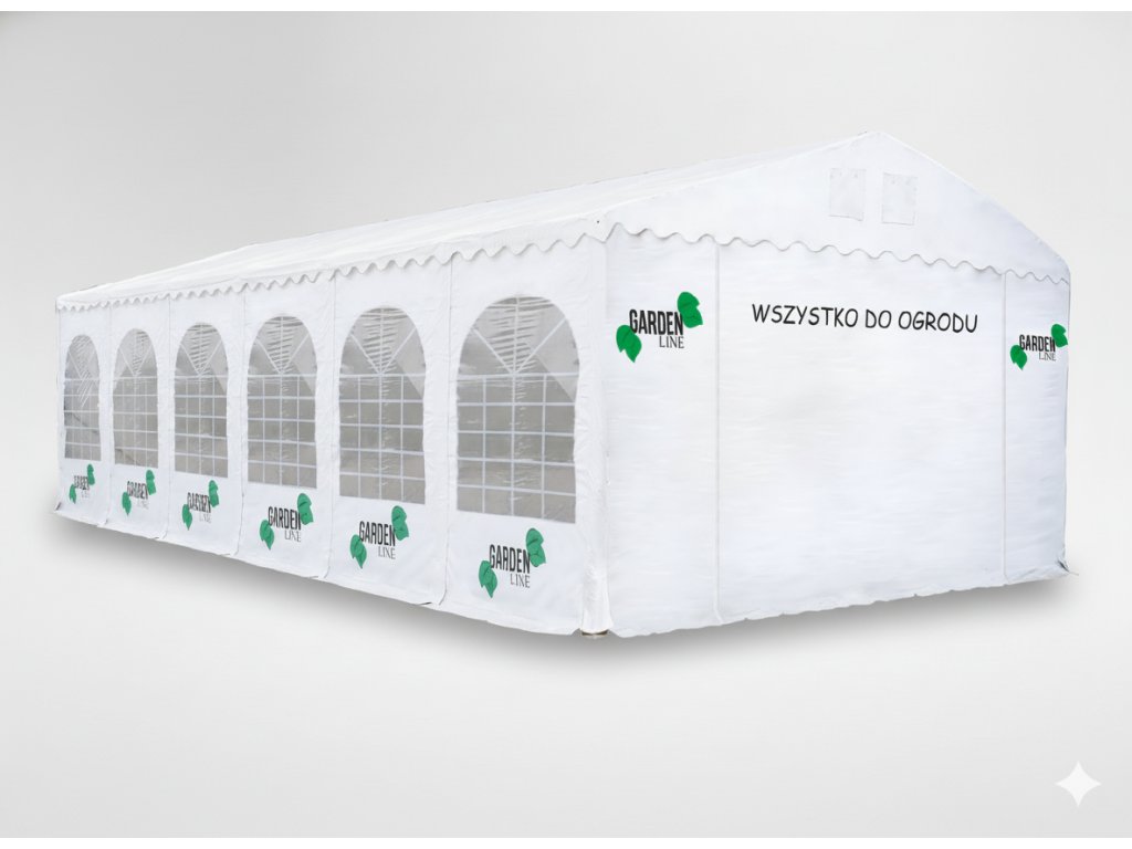 Profesionální prodejní stan s gramáží 550 gsm PVC, nehořlavý. Vybaven 12 dekorativními obloukovými okny, která vytvářejí světlou a otevřenou atmosféru. V horní části štítových stěn se na obou koncích střechy nacházejí 2 ventilační otvory s krytem. Stan obsahuje uzemňovací tyč a dodatečné vyztužení střešní konstrukce, což zaručuje vysokou stabilitu. Štítové spojení je umístěno pod úhlem 120 stupňů a výška je 4,6 m. Stan má 4 výztuhy v každém rohu a 4 dlouhé podpěry s průměrem 32 mm při každém vstupu. Jsou v něm 2 vstupy se zipem na obou stranách. Celkem 16 kusů loga o rozměrech 100x60 cm se zelenou linií a 1 linie písmen na vlně nad vstupem. S páskem na suchý zip podél krytů nohou, který spojuje stěny a chrání před větrem a deštěm.TECHNICKÉ ÚDAJE: