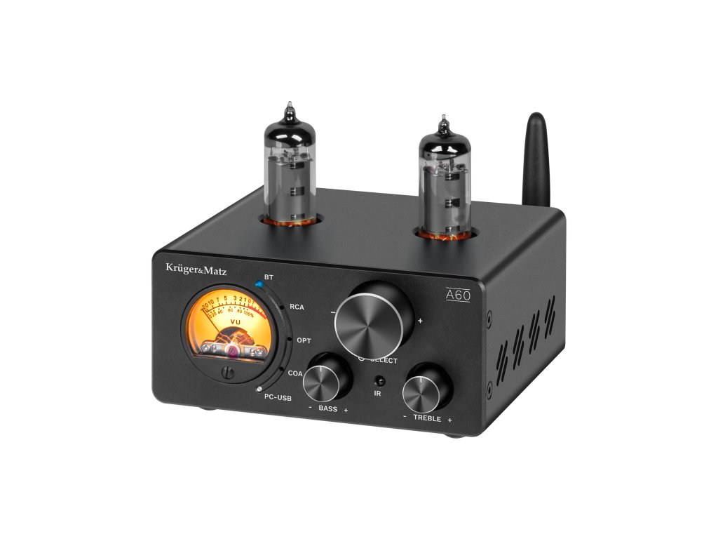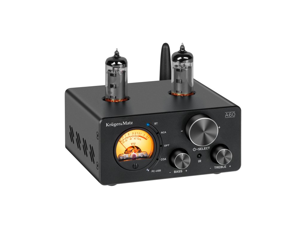 S výkonem 2x100 se stereo zesilovač Kruger&Matz vyznačuje použitím lamp 6K4, které vytvářejí teplý a přirozený zvuk s velkou hloubkou a jasností.